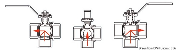 Verteilerventil aus vernickeltem Messing. Rot lackierter Stahlhebel. Arbeitstemperatur von -10° bis +100°.Für Wasseranlagen, Benzin, Heizung und nicht korrosive Flüssigkeiten.