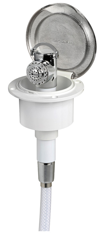 Ντους από επιχρωμιωμένο ορείχαλκο, λευκό περίβλημα από ανθεκτικό στην υπεριώδη ακτινοβολία ASA.