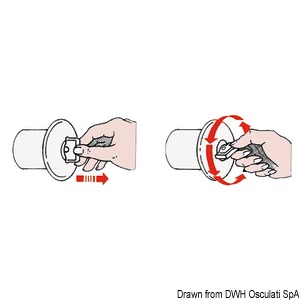 Ειδικό σύστημα ανοίγματος που αποφεύγει τη χρήση κλειδιών, νομισμάτων ή άλλων. Σχεδιασμένο έτσι ώστε να καλύπτει το καπάκι εντελώς τη βιδωτή φλάντζα, βελτιώνοντας τη στεγανότητα. Έκδοση με ευθύγραμμο ή κεκλιμένο σωλήνα σύνδεσης 30° (χρησιμοποιείται όταν το επίπεδο τροφοδοσίας είναι κεκλιμένο, συμβατό με ISO 8099/1). Πλήρης με εσωτερική αλυσίδα, Ø max 88 mm. Σε συμφωνία με τον κανονισμό της RINA.
