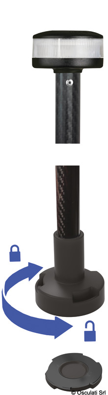 Αφαιρούμενη λευκή φωτεινή ράβδος 360° με ορατότητα 2NM. Διαθέτει μια ειδική βάση στήριξης που επιτρέπει τη λειτουργία μέσω ασύρματης επαφής, έτσι δεν υπάρχουν εκτεθειμένες μεταλλικές επαφές και εξασφαλίζεται πλήρης αδιαβροχοποίηση. Η ράβδος είναι ασφαλισμένη στη βάση με ένα στιβαρό σύνδεσμο μπαγιονέτας, μόλις αποθηκευτεί, παραμένει μόνο ένας μικρός επίπεδος δίσκος στην καρίνα για τη σύνδεση.