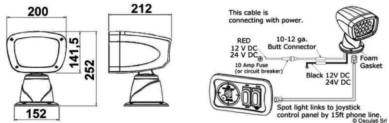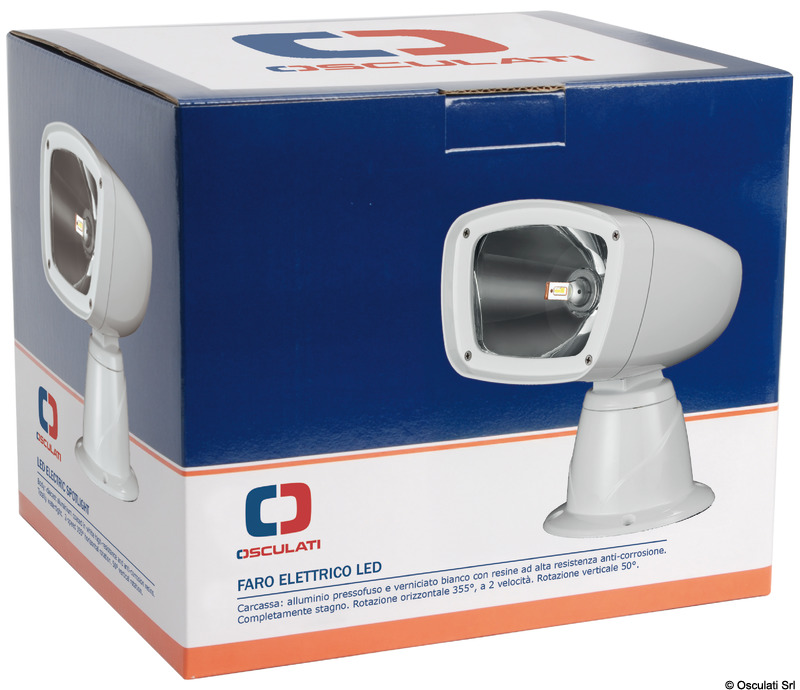 Σκελετός: χυτό αλουμίνιο λευκού χρώματος με ρητίνες αντιδιαβρωτικές υψηλής αντοχής. Πλήρως αεροστεγής. Οριζόντια περιστροφή 355°, με 2 ταχύτητες. Περιστροφή κατακόρυφη 50°. Υψηλής ποιότητας Combo LED .Κατανάλωση 54 W ισοδύναμη με πάνω από 100 W ενός κλασσικού λαμπτήρα.Έκδοση με ισχυρό κεντρικό LED (αντικαταστάσιμο σε περίπτωση θραύσης), 40+40 watt.Συσκευή διπλής λειτουργίας Spot φως με συγκεντρωμένο (20°) και Flood ευρύ φως (45°).Προστασία από ηλεκτρονικές παρεμβολές.Τα φώτα μπορούν να συνδεθούν σε 2 τύπους προαιρετικών εντολών που μπορούν να είναι ανεξάρτητες ή "συνδυασμένες" για να δημιουργήσουν την επιθυμητή διαμόρφωση:1) Χειριστήριο από το πίνακα με joystick. Καλώδιο συμπεριλαμβανόμενο 4,5 μ. Μπορούν να εγκατασταθούν άλλα χειριστήρια joystick χρησιμοποιώντας το καλώδιο με 2 θύρες 13.227.51.2) Κλασικό ραδιοκοντρόλ με βάση στήριξης για τοποθέτηση στον πίνακα. Εμβέλεια έως 40 μέτρα από το φάρο.