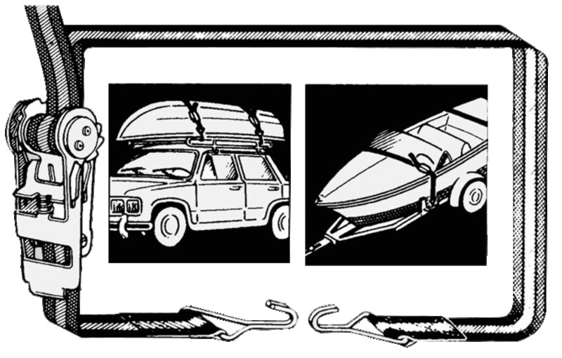 Ανθεκτικά στις ακτίνες UV, εφοδιασμένα με τερματικά γάντζους από γαλβανιζέ ατσάλι και ενδιάμεσο ρατσετ, επίσης από γαλβανιζέ ατσάλι, για να τεντώσετε τη ζώνη όπως επιθυμείτε. Κατάλληλα για τη στερέωση των κελύφων στην οροφή του αυτοκινήτου ή στα τρέιλερ μέσω των δακτυλίων της πρύμνης ή της πλώρης.