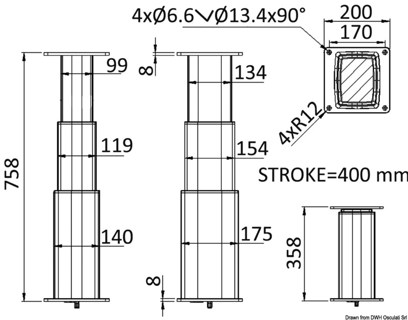 Κατασκευασμένη από ανοδιωμένο αλουμίνιο με συστατικά για εσωτερική και εξωτερική χρήση. Για τη λειτουργία του ποδιού απαιτείται ο διακόπτης 48.749.01.Μπορεί να χρησιμοποιηθεί σε ζεύγη αγοράζοντας το κουτί συγχρονισμού 48.749.10Είναι δυνατή η πραγματοποίηση προσαρμοσμένων υψών με ελάχιστη παραγγελία 10 τεμαχίων.