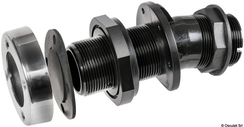 This system ensures the following advantages in a single product:• Easy installation (1 operator only)• Pre-assembly of the gate valve and hose holder at the workbench (threaded version)• Locknut for positioning the gate valve in the desired position (threaded version);• Drainage without unwanted siphon formation thanks to 13° inclination• Integrated non-return valve in case of reverse• Stainless steel finish with countersunk screws. Assembly sequence:• Workbench pre-assembly of gate valve and hose holder (option to choose valve handle positioning)• Insertion of the pre-assembled module from inside (optional pre-fixation with self-tapping screws from inside) - end of internal installation;• Screw tightening of the final fixing nut from outside• Cutting of the exceeding part• Non-return valve plate mounting;• Fastening of the stainless steel cover with countersunk screws.