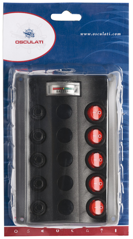 Made of black plastic, equipped with toggle switches and resettable thermal automatic fuses. Equipped with sticking labels to identify the different uses.