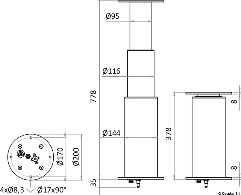 Pata de mesa eléctrica redonda en tres etapas de aluminio anodizado plateado, apropiada tanto para el exterior como para el interior del barco, con anti-rotación.Para el accionamiento de piernas individuales es necesario un interruptor (ON)-OFF-(ON) tipo 14.192.03 o similar.Para operación en pareja, pedir centralita/receptor 48.730.02Para operación con control remoto, pedir unidad de control/receptor 48.730.02 + 48.730.03.