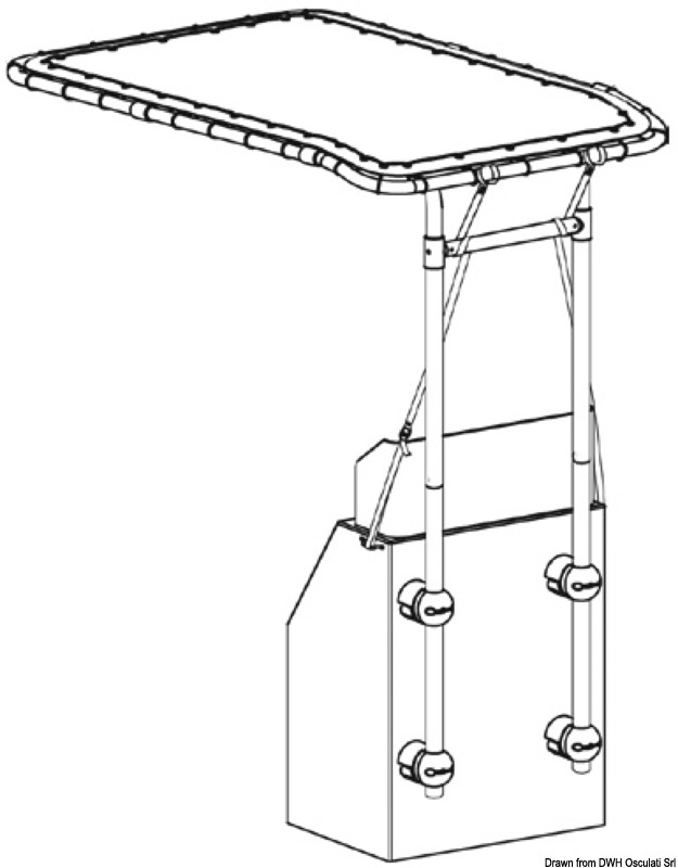 Estructura tubular anodizada en aleación ligeraAltura ajustable (máx 205cm); en reposo puede ser retraído o desmontado de los soportes.El sistema de fijación, totalmente ajustable, permite la instalación tanto en los lados como en el frente de la consola y también se puede utilizar en consolas muy pequeñas.En reposo, puede ser retraído o extraído de los soportes.La tela del Top está hecha de poliéster ATLAS azul de 310 g/m2, impermeable y resistente a los UV.