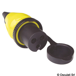 Clavija volante hembra (de policarbonato + Moplen) con sistema de sujeción de cable y contactos de latón plateado; capuchón protector de PVC con anillo de rotación rápida en Luran resistente a los rayos UV.