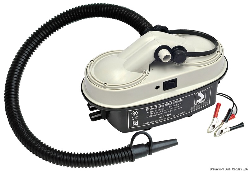 Ova pumpa je visokog pritiska, te se gumenjak može napuhati kompletno sa Bravo Electric-om, bez potrebe finalne intervencije sa ručnom ili nožnom pumpom. Služi i kao pumpa za ispuhivanje, i ima univerzalne priključke. Uređaj se zaustavlja sam kada se dostigne podešeni pritisak.