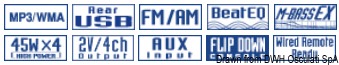 Izrađen kako bi omogućio maksimalnu zaštitu od ulaska vode i otporan na sol ( brtve gumene, sa utorima za ispust, sa zaštitom od špricanja). - Predispozicija za CD-DA/CD-R/RW; - USB priključak;- Kompatibilan sa MP3, WMA i iTunes® AAC, sa ekranom ID3-TAG;- Preselekcionirani 18 FM/ 6 AM;- BBE®MP za bolji zvuk uključen;- optimalizacija audio Beat EQ - LCD visoke vidljivosti od 13 x 8;- Izlaz audio na 2 ili 6 kanala- Predispozicija za novu daljinsku komandu sa kabelom (do 3)- Otporan na izlaganje suncu/magli/UV-zrakama;- Dimenzije (L × H × P) (mm): 198 × 91 × 208