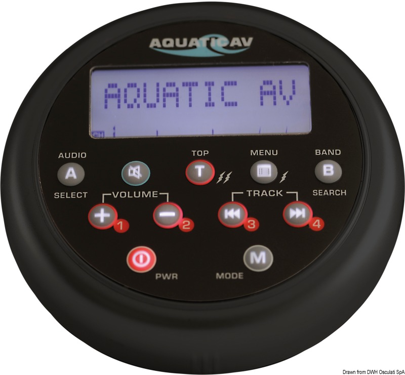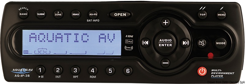 Radi prijemnici inovativni izrađeni isključivo za upotrebu u nautici, vodonepropusni IP66, sa kučištem od inoxa (jedini na tržištu)] Tehničke karakteristike - kučište u koje se direktno umetnu iPod/iPhone bez bilo kakvog adaptera (29.549.00), sa izbornikom na poklopcu; mogućnost snimanja podataka/glazbe u formatu MP3; frekvencije AM (može ih se odabrati i memorizirati 6), FM (1može ih se memorizirati 18); pojačalo 50 W za 4 kanala; sat; izlaz subwoofer plug and play; izlaz satelitski za XM; predviđen za 3 daljinske komande bežične. Napajanje 12 volta. Kontrole SOFT TOUCH.