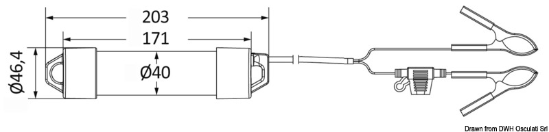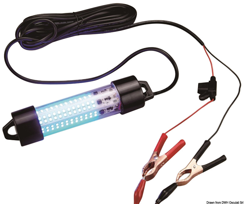 Daje snažnu bijelu LED svjetlost koja privlači ribe. Kučište od polikarbonata. Svjetlo 360°.Kompletna sa utikačem za spajanje tipa upaljača za cigarete i sigurnosnim osiguračem.Može se koristiti i kao lampa za osvjetljenje jer se može koristiti kako uronjena tako i na suhom.