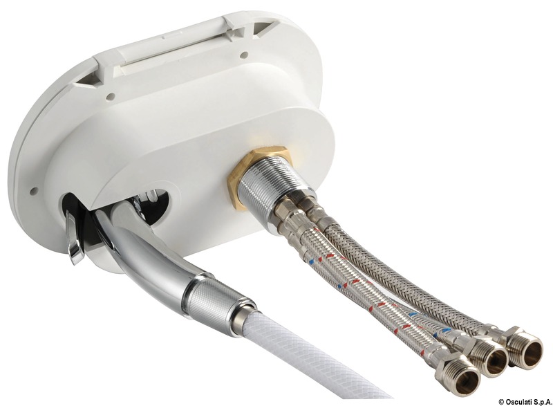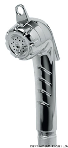 Tuš od kromirane plastike, prostor za smještaj bijele boje od ASA otpornog na UV zrake. Kompletan sa slavinom mješalicom za toplu/hladnu vodu. Montaža na ravnu plohu ili na stijenku.