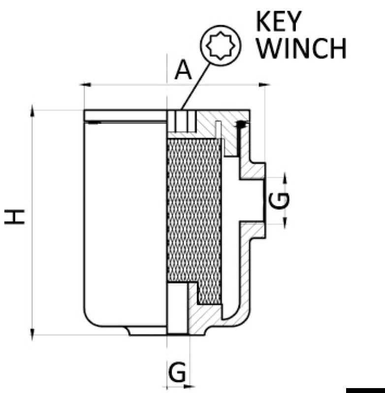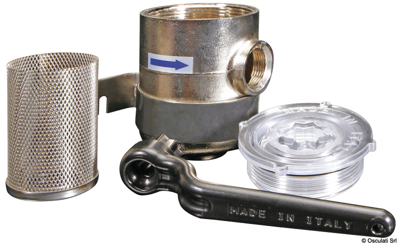 Model čaše s bočnim otvorom i jednim na dnu. Od nikliranog mesinga s unutarnjim filtarskim elementom od nehrđajućeg čelika i prozirnim poklopcem na navoj od polikarbonata. Okretna potporna traka od nehrđajućeg čelika. Oktogonalni ključ tipa "winch" za lako otvaranje poklopca je uključen.