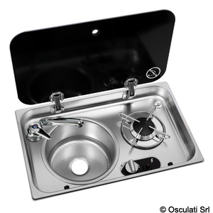 Kuhala od nehrđajućeg čelika s poklopcem od sivog (fume') kaljenog stakla, kompletna s miješalicom za toplu i hladnu vodu.