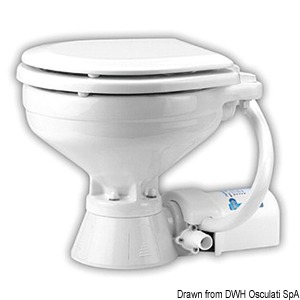 Školjka od bijele keramike, daska od drva. Prekidač za upućivanje uključen. Priključak za cijev ulazni 19 mm, izlazni 25 mm. Pumpa samousisavajuća do 1,2 m. Može biti montiran do 90 cm ispod vodene linije.