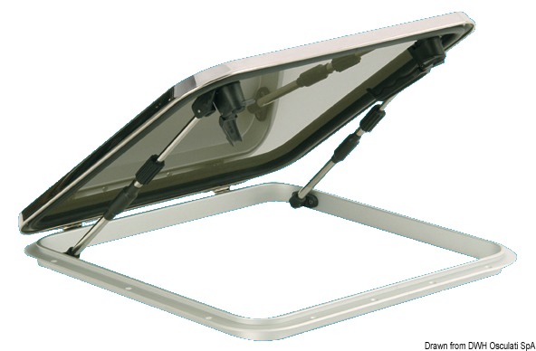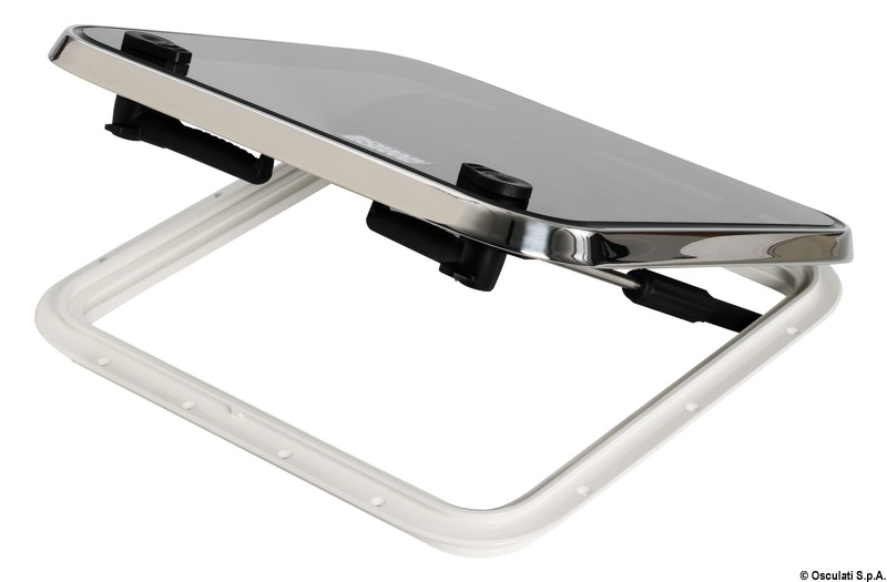 Baza od bijelo obojane lake legure, vratašca od sjajnog inoxa AISI 316, prozirni dio od polikarbonata dimno sive boje - fumé.