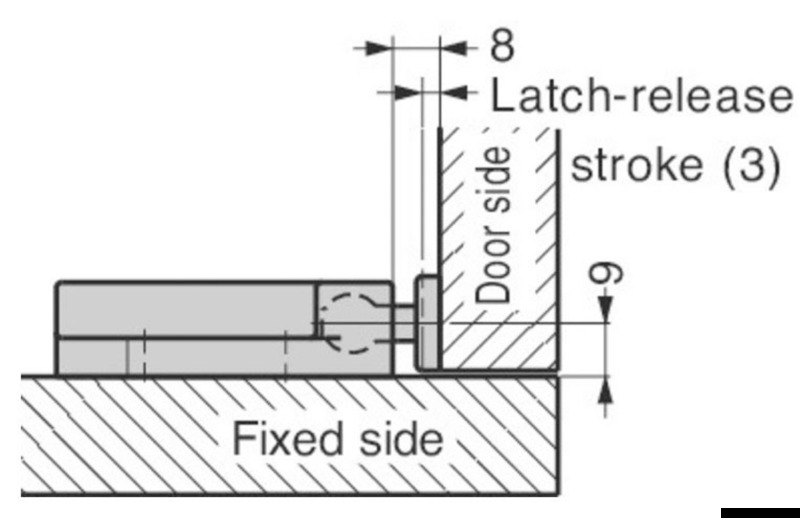 Tijelo od ABS-a. Za vrata bez jabučica ili ručki.Pločica s laganim poravnavanjem.Nemagnetski.Hod otpuštanja oko 3 mm
