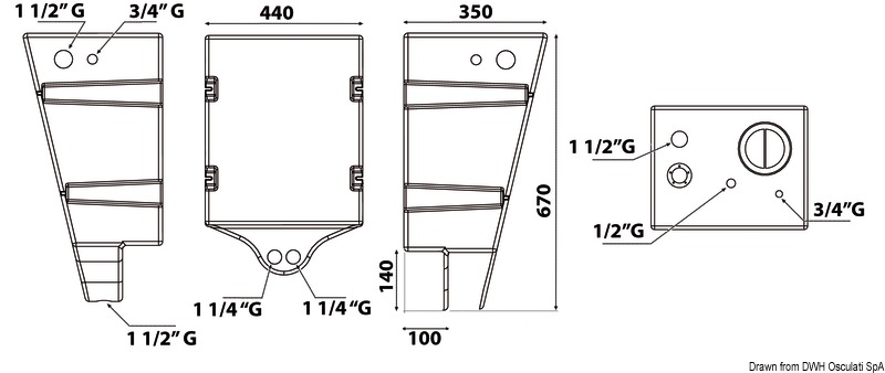 Pogodno za montažu iza ormara ili u šupljinama.Kompletan s ženskim navojima od 1/2" - 3/4" - 1" 1/2 za utovar, istovar, ventilaciju + prirubnica pokazivača razine.