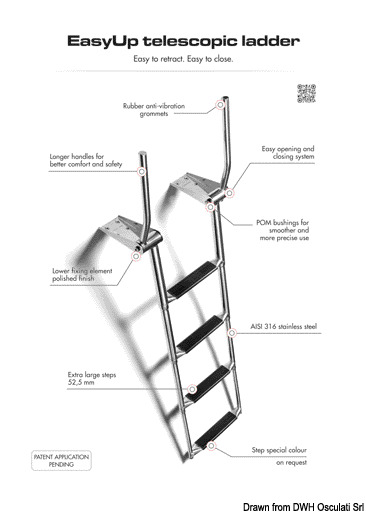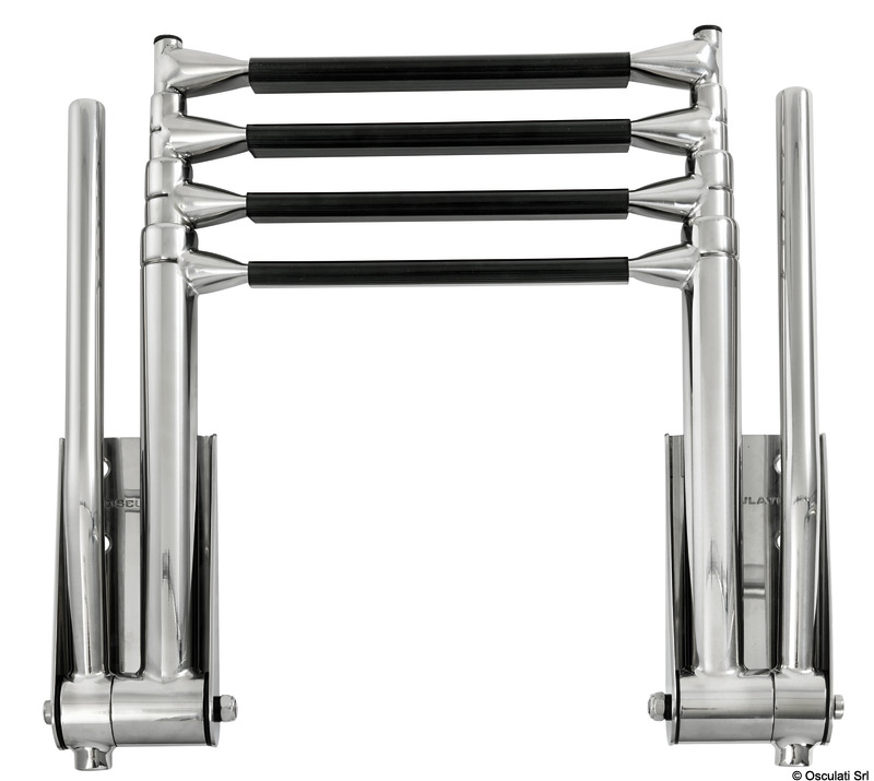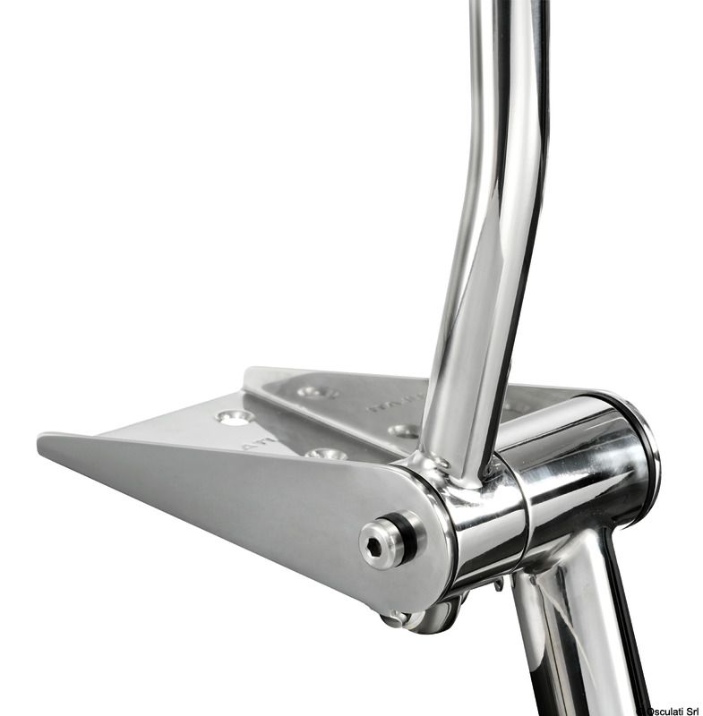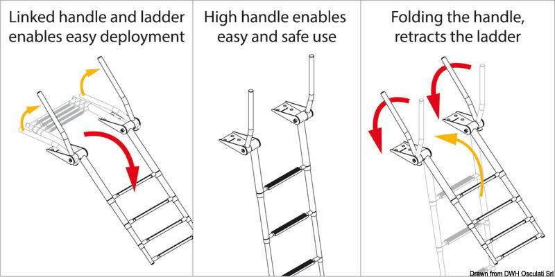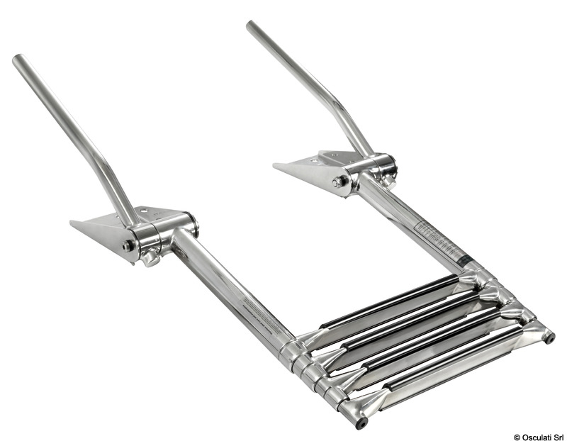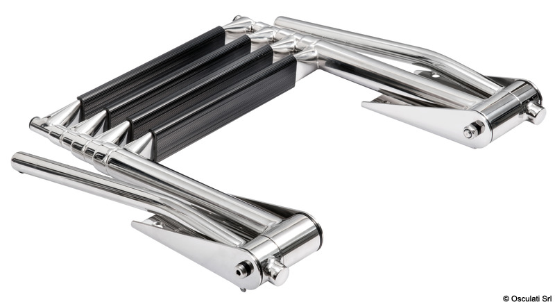 Ručkice za prihvat se automatski podižu otvaranjem stepenica. Spuštanjem ručkica stepenice se skupljaju.Stepenica tipa "Extra large" 52,5 mm.Sjajni inox AISI 316.
