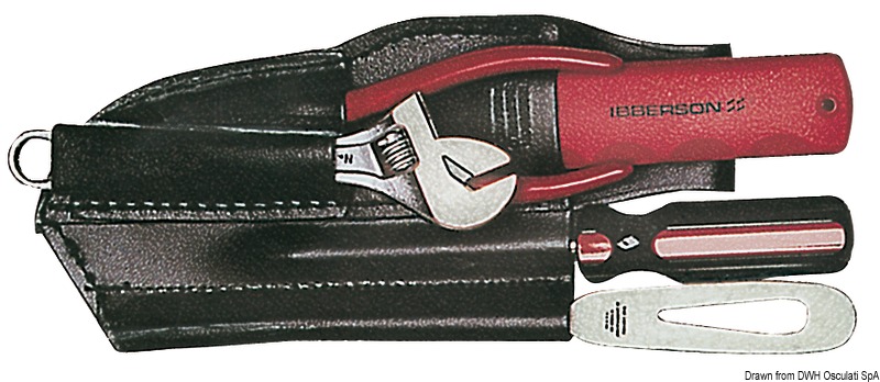 Sadrži: nož i šilo od inoxa, odvijač, kliješta i engleski ključ od kromiranog čelika, sve u elegantnoj kožnatoj futroli.