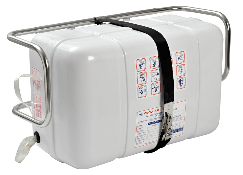 Uniwersalny do wszystkich tratw turystycznych od 4 do 12 miejsc; - Mocowanie za pomocą stosownych zacisków z nierdzewnej stali tłoczonych precyzyjnie, pełny zestaw 4 sztuk); - Blokada tratwy przy użyciu wytrzymałego pasa z nierdzewnej stali powleczonego tworzywem + zaczep krzywkowy wyposażony w uchwyt na kłódkę; - Szybkie wodowanie po otwarciu zaczepu krzywkowego; - Cała struktura z nierdzewnej, polerowanej stali AISI 316.