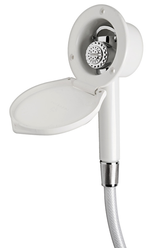 Prysznic z chromowanego mosiądzu, pojemnik z tworzywa sztucznego ASA odpornego na działanie promieniowania UV. Występ wewnętrzny 45 mm.