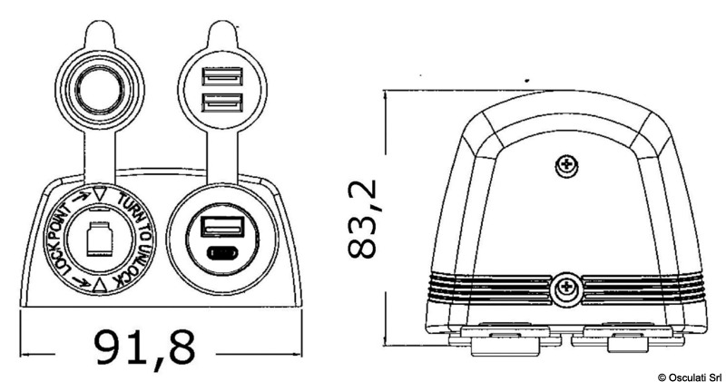 Z nylonu, z wieczkiem zabezpieczającym gwarantującym wodoszczelność. Wejście 12/24 V. Wyjście USB 5V.