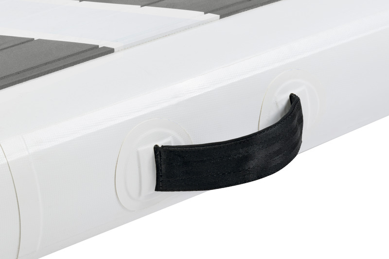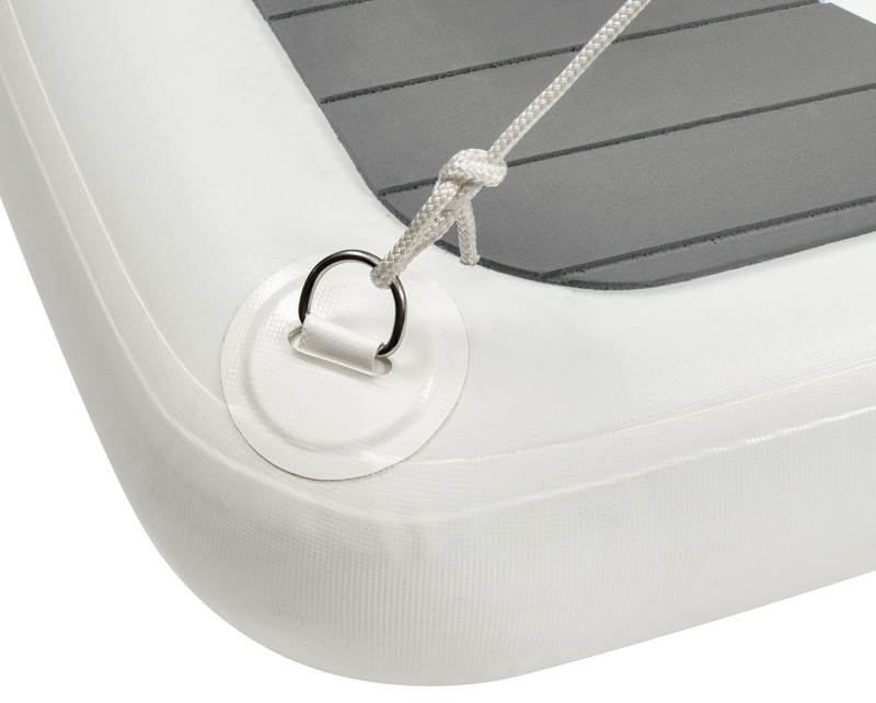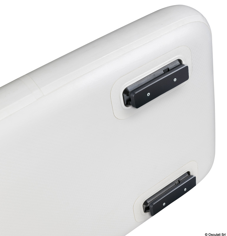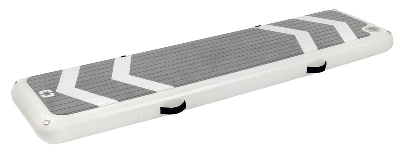 Nadmuchiwany pomost Osculati wykonany jest z PVC z wysoką wytrzymałością na ścieranie i promieniowanie UV.Technologia Dropstitch stosowana w deskach SUP sprawia, że są one niezwykle sztywne i bezpieczne, zapewniając bezpieczne i wygodne użytkowanie.Zawiera antypoślizgową powierzchnię z EVA na górnej części do chodzenia i na dolnej części sliderów z Nylonu, aby zapobiec zużyciu na molo.Aby użyć pomostu, można go napompować za pomocą pompy ręcznej lub elektrycznej do ciśnienia 15 PSI – 1 bar, a następnie opróżnić i łatwo schować do schowka dzięki swoim kompaktowym wymiarom (80x30x15 cm).Kolejną funkcją tego produktu jest możliwość wykorzystania go jako deski SUP z płetwami; usuwając nylonowe slidery, można zamontować dwie płetwy zaczepne, które umożliwiają dobre wiosłowanie. Dla bezpiecznego poruszania się po pomoście dostępny jest dodatkowy zestaw poręczy (kod 42.681.90).Wykonany z dwóch prętów o średnicy 30 mm z aluminium oraz liny żeglarskiej o średnicy 6 mm z linką napinającą.System jest łatwy w montażu i demontażu dzięki hakom o wysokiej wytrzymałości umieszczonym na krawędzi pomostu.