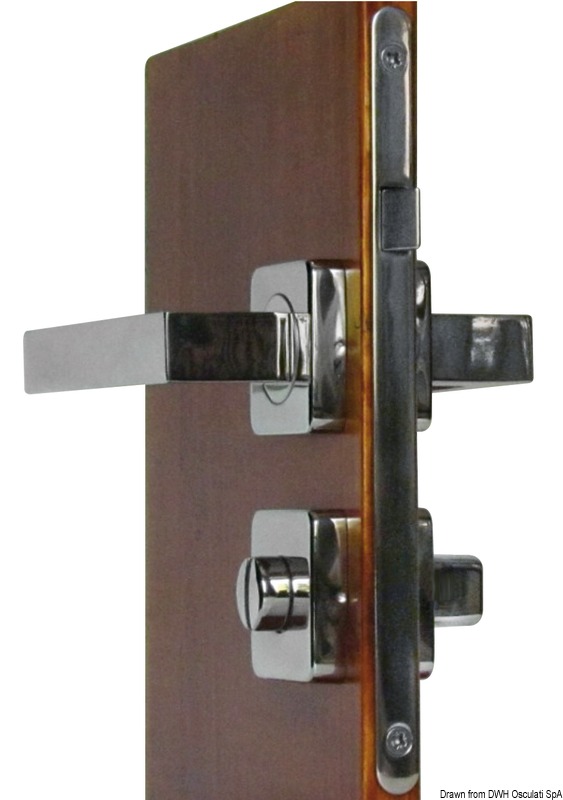 Комплект состоит из дверной ручки Nauta, внутренне задвижки с фиксатором. Квадратные накладки.